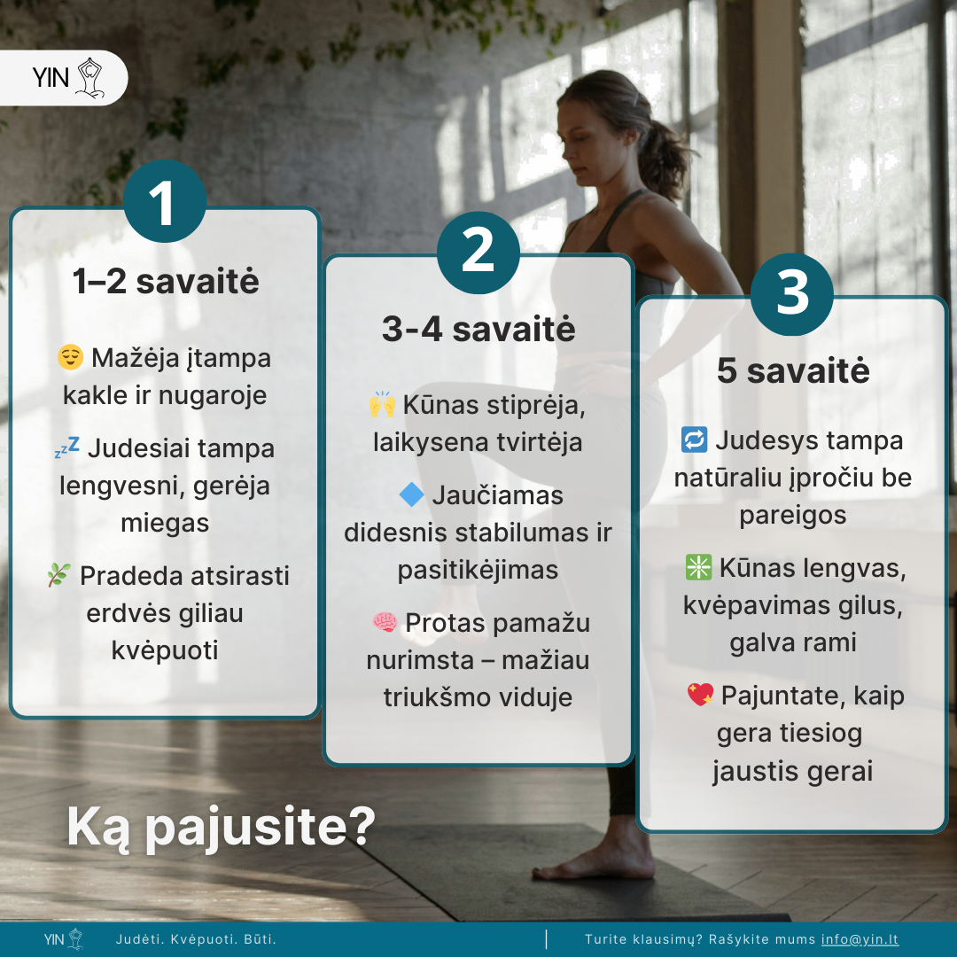 - 5 savaitė: judesys tampa natūralia dienos dalimi, jaučiatės lengvai ir harmoningai